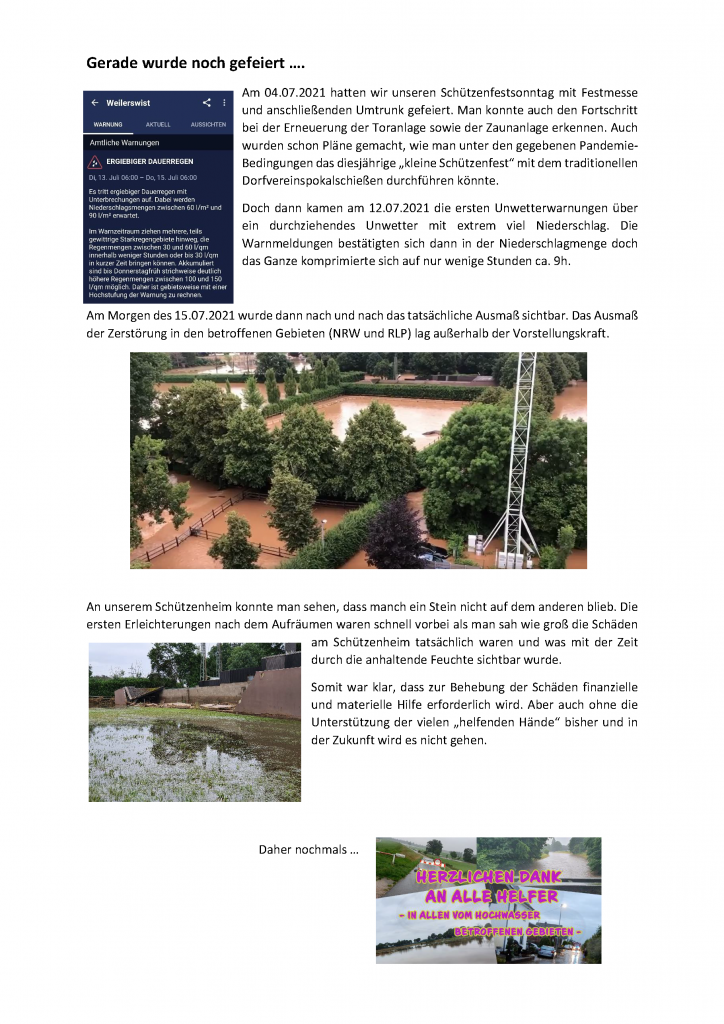 In dieser Zeit waren Vereinstätigkeiten nur eingeschränkt möglich. Zum einen durch die noch anhaltende Coronapandemie. Hinzu kamen dann noch die Zerstörungen durch die Hochwasserflut 2021. Nach der Aufhebung der Maßnahmen zur Eindämmung der Corena-Pandemie stand dann die Sanierung des Vereinsheim auf dem Programm. Während dieser Zeit waren keine Veranstaltungen im üblichen Rahmen möglich. Es wurde überall improvisiert, um zumindest kleiner Veranstaltungen durchführen zu können.