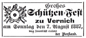 Im Sommer kamen die ersten Initiativen und Vorschläge von einigen Männern zur Gründung einer Schützengesellschaft. Im Herbst trafen sich einige Männer zur Gründung der Schützengesellschaft St. Helena Vernich. Erster Vorsitzender wurde Jakob Weber.