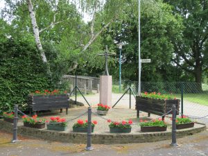 Präses Pastor Burkhard Hoffmann weiht das von Dietmar Schneider gestiftete Denkmal mit einem in Bronze gegossene Kreuz, auf dem Schützenplatz ein.